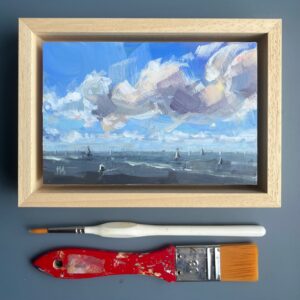 De kliffen zijn spectaculair op de Faeröer eilanden. Dit is de klif met het James Bond Memorial. Mooi! Dit minischilderijtje wordt geleverd in een houten lijstje.