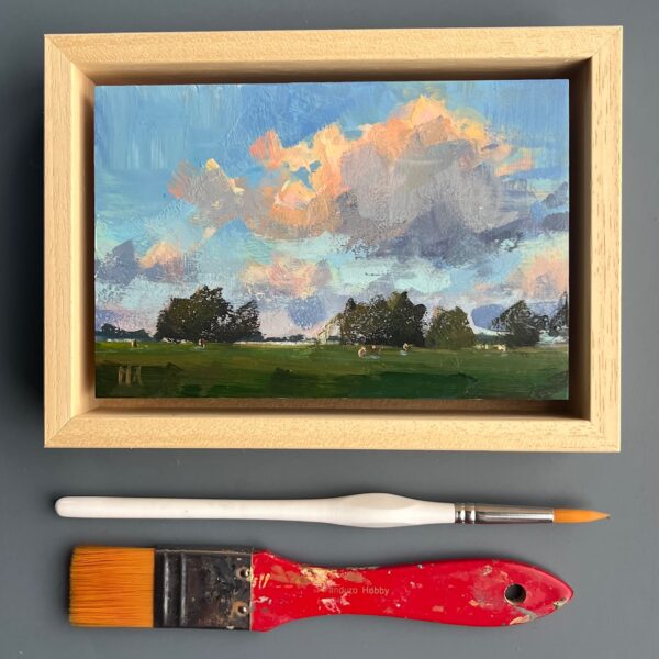 Dit minischilderijtje wordt geleverd in een houten lijstje.
