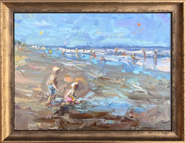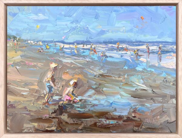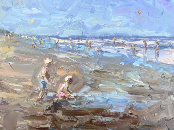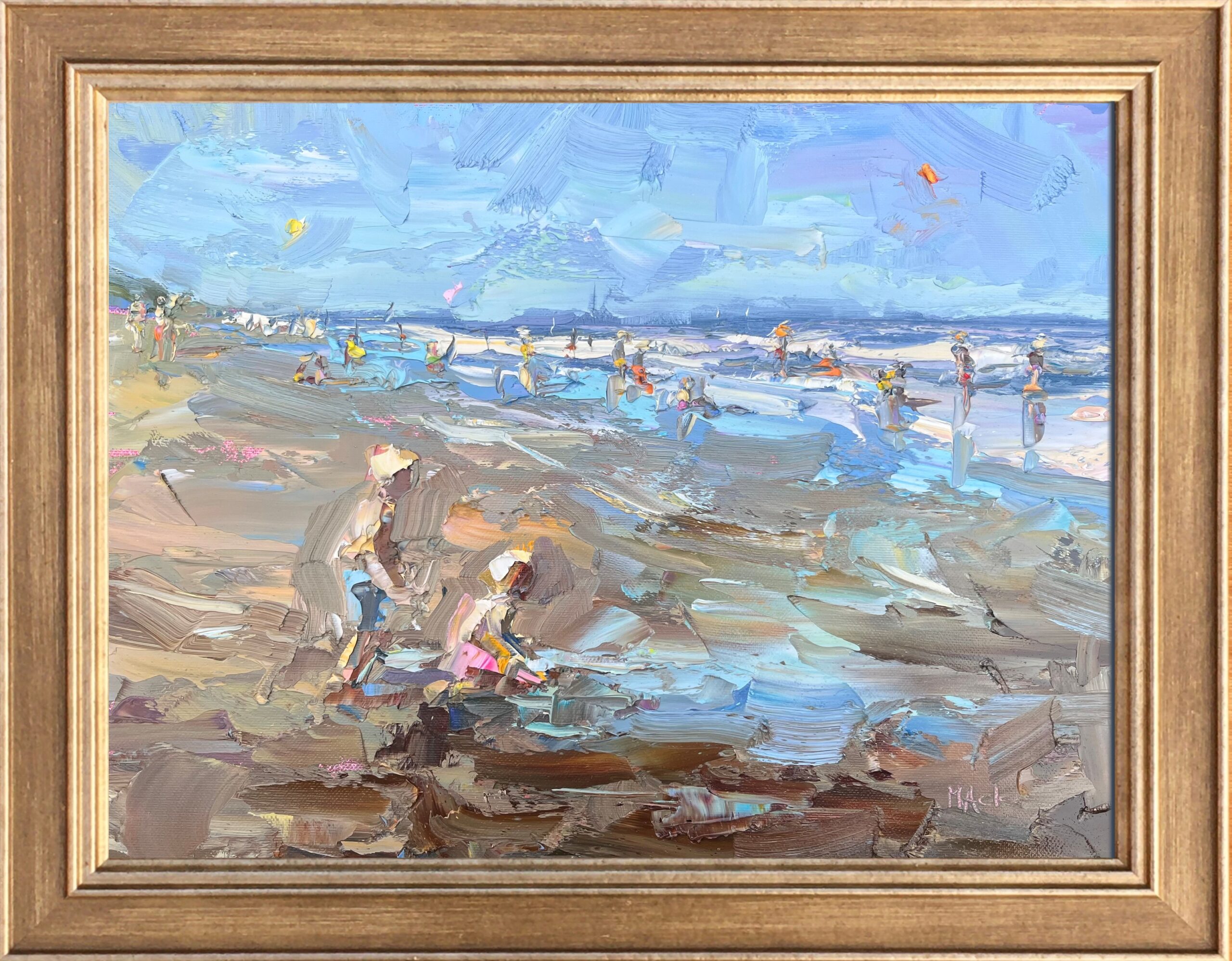Deze levendige, energieke impressie vat de essentie van een drukke zomerdag aan zee - vol beweging, warmte en dat zorgeloze vakantiegevoel.