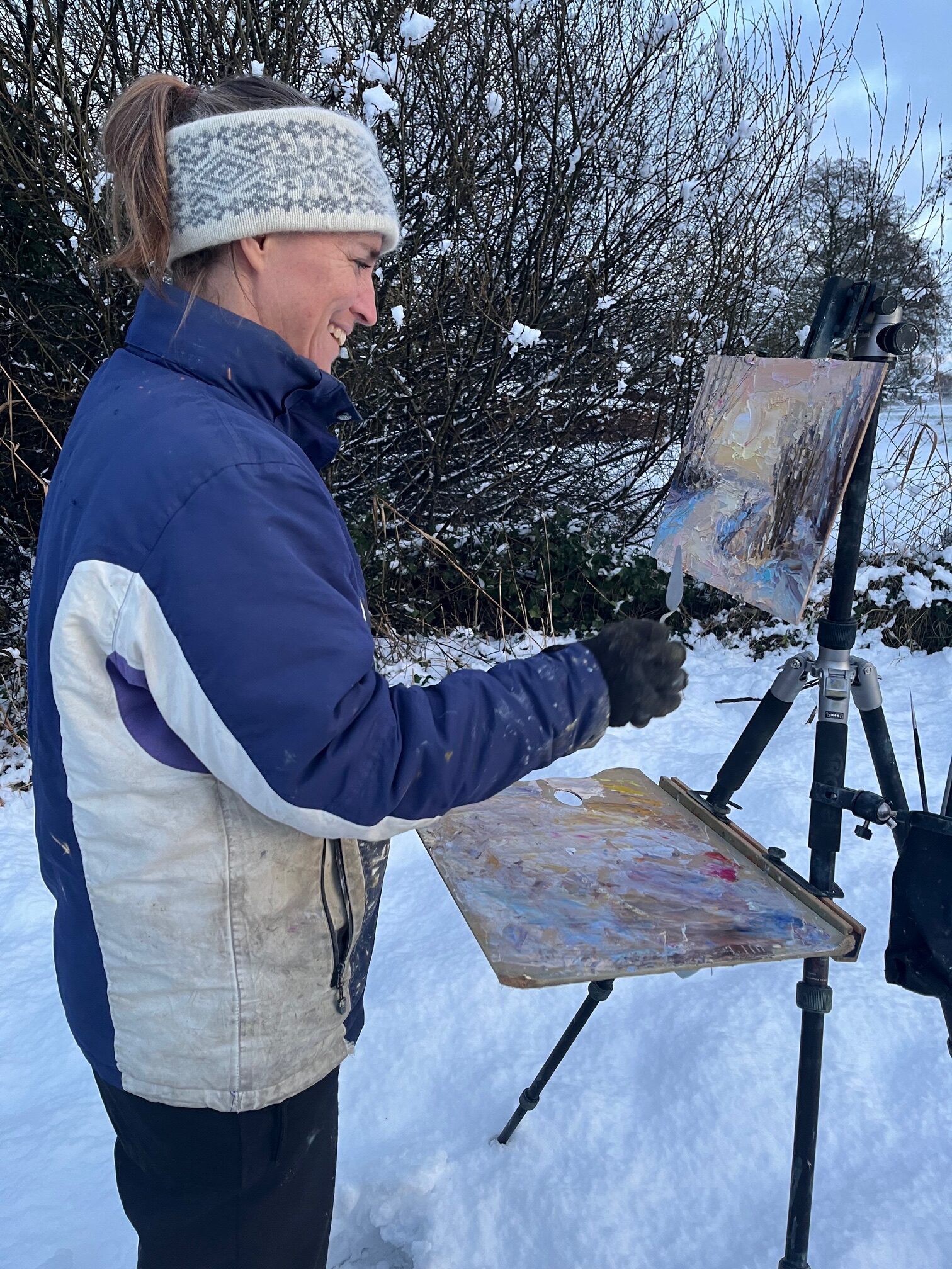 Zo, dit is een geweldige start van 2026! Ik waande mij in een winter wonderland. Wat is het fijn om samen sneeuwballen te gooien, sneeuwpoppen en iglo's te bouwen en natuurlijk te schilderen! Goed aangekleed met thermokleding ging ik op pad. Een warme ondergaande zon kleurde de sneeuw in pasteltinten. De sneeuw mag van mij nog wel even duren!