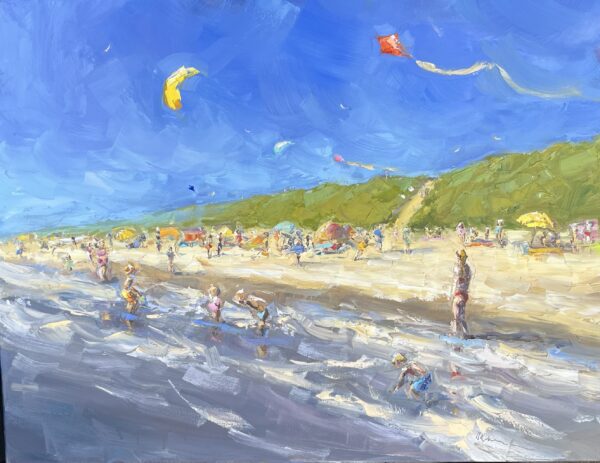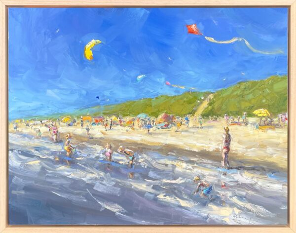 A lively beach scene full of light, color, and movement. The wind plays with kites above the sand, while children splash in the surf. The loose brushstrokes capture the warmth of a summer day at the seaside. A painting that evokes the carefree atmosphere of vacation.