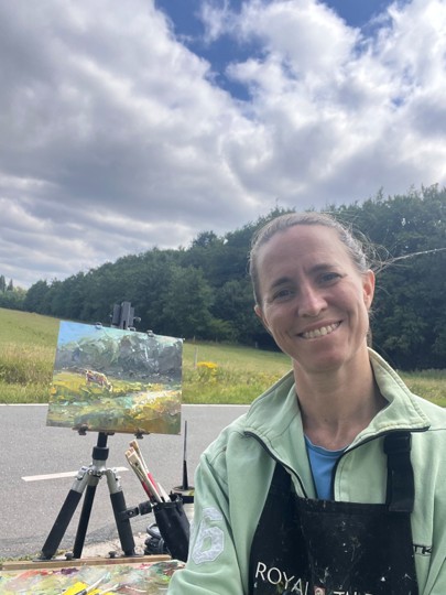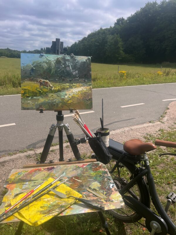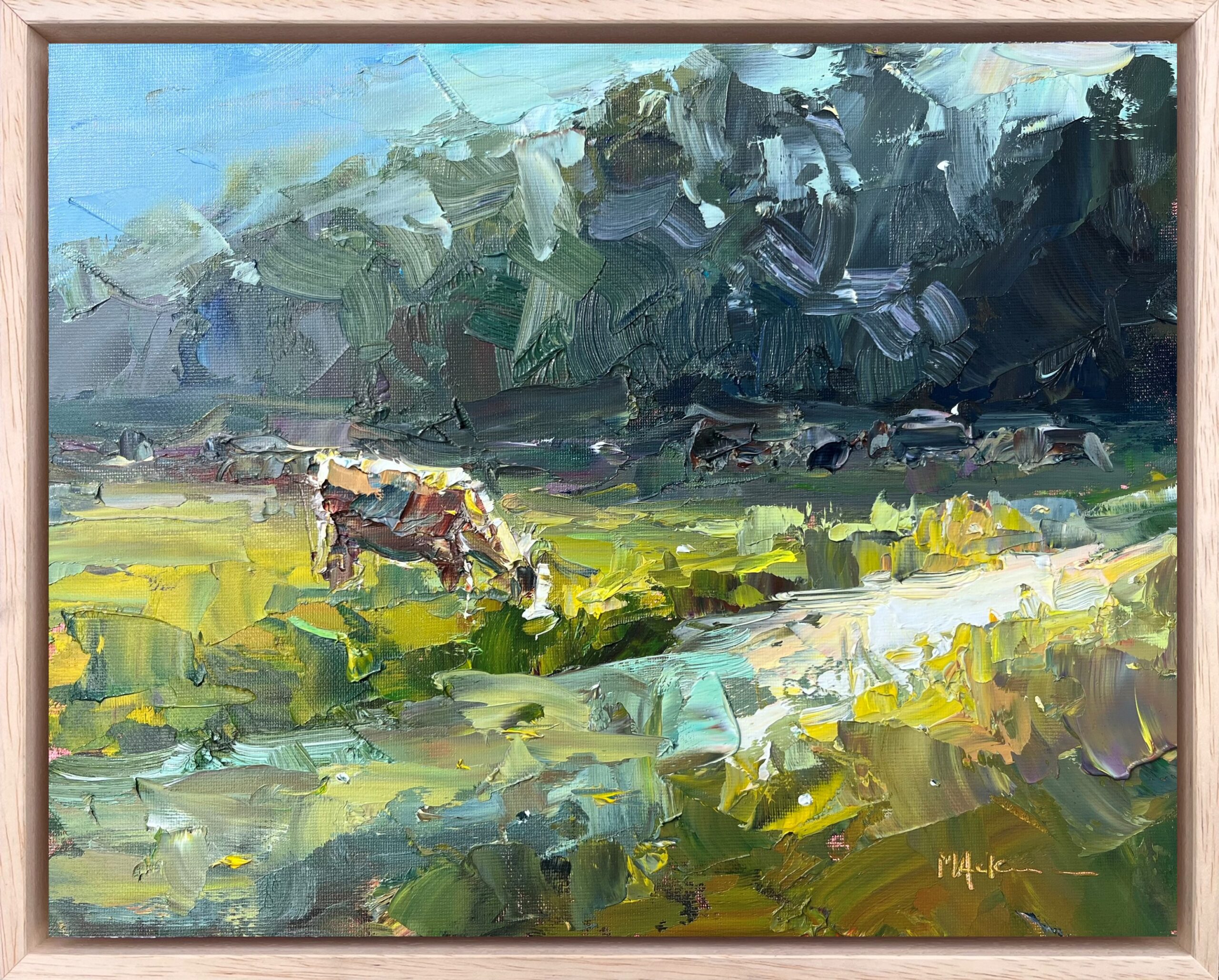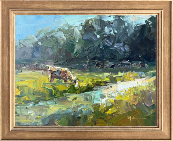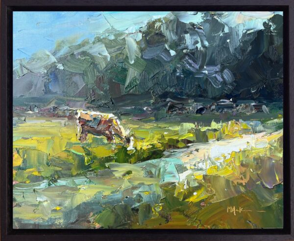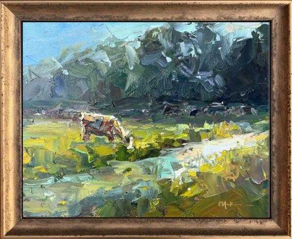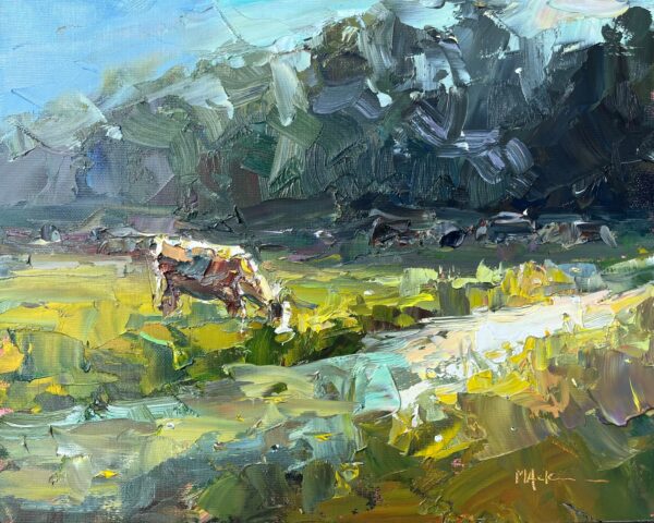 I was looking for a good place to paint cows. I thought this spot was great because of the backlight and the reflection on the ditch. I am happy with the strong light on the ditch and the cow.